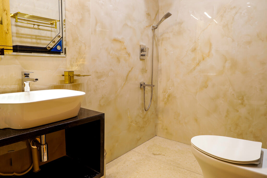 The natural coolness of Italian marble combined with elegant teakwood frames creates an atmosphere of understated luxury — simplicity carried to an extreme elegance.